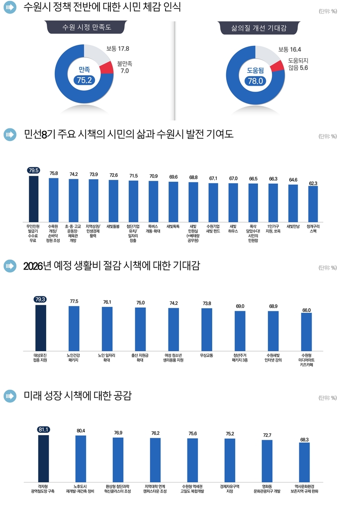 ◦응답자 78.0%, ‘수원시 정책이 내 삶을 더 좋게 만드는 데 도움이 될 것’ ◦시민이 체감한 정책, 일상 속 불편 줄이거나 경제적 경제적 부담 낮춰주는 실속형 사업 ◦격자형 광역철도망구축, 노후도시 정비 등 미래 성장 시책 공감도 80% 이상 |