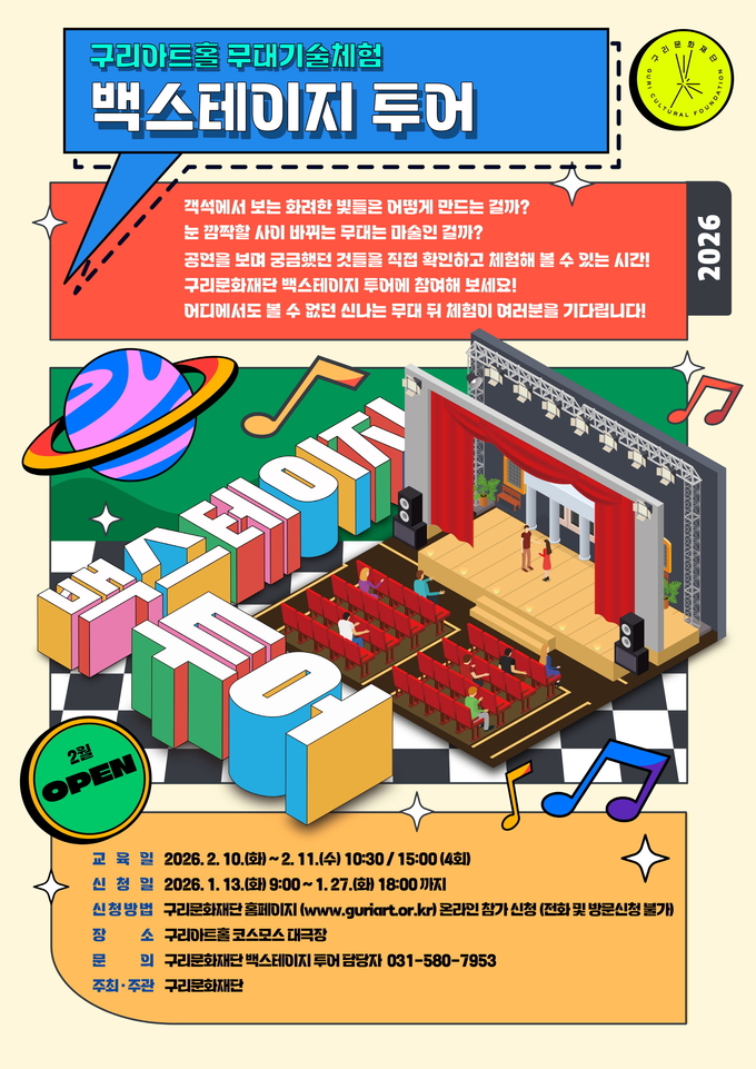 본 프로그램은 2월 10일부터 11일까지, 총 2일간 구리아트홀 코스모스 대극장에서 진행되며, 무대·음향·조명 등 공연 제작 전반에 대한 설명과 함께 실제 장비를 활용한 체험 중심으로 운영될 예정이다.