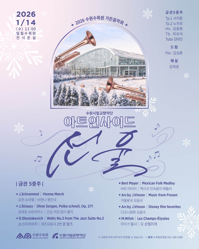 [정도일보 고정희 기자] 수원특례시(시장 이재준)는 1월 14일 일월수목원 전시온실에서 수원시립교향악단 아트인사이드 ‘선율’을 개최한다.