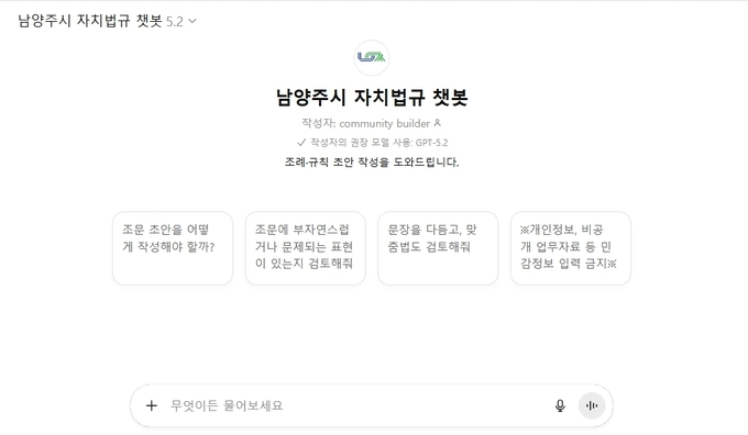 ‘남양주시 자치법규 챗봇’은 생성형 AI 기술을 기반으로 법제처의 입안 지침, 사례, 문장 정비 기준, 쟁점별 해석 자료 등을 학습해 △조문 작성 △문장 검수 △입법례 제공 등 실무에 필요한 다양한 기능을 수행한다. 특히 공유재산, 보조금, 위원회 등 행정 일반 분야 중심으로 자치법규 초안을 구성할 수 있도록 대화형 서비스를 지원한다.