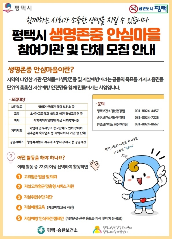 「생명존중 안심마을」 사업에 참여를 희망하는 기관이나 단체는 평택시 정신건강복지센터(평택보건소 031-658-9818, 송탄보건소 031-8024-7226, 안중보건지소 031-8024-8667)로 문의하면 된다.