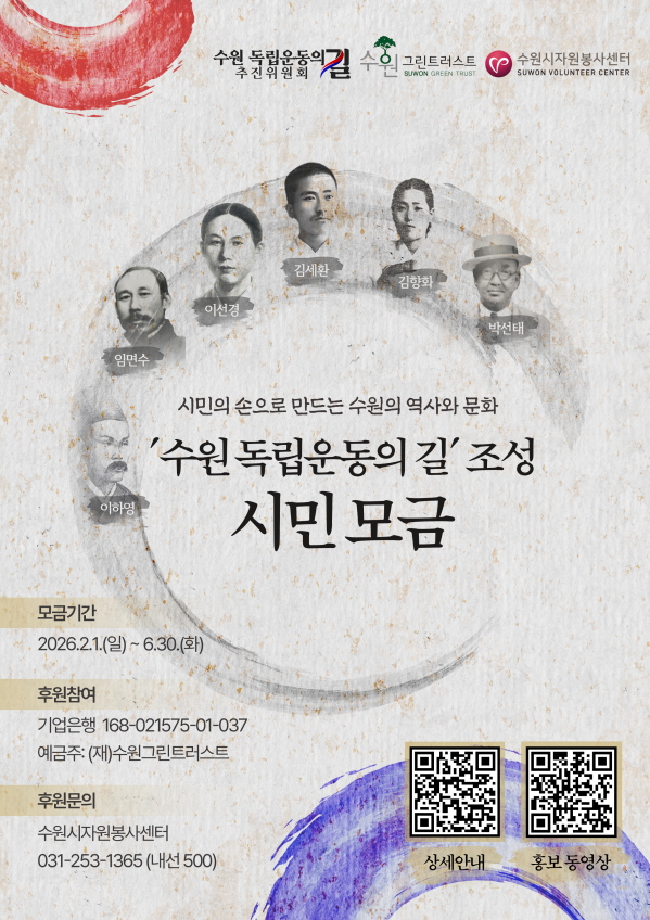 이와 함께 추진위와 (재)수원그린트러스트는 ‘수원 독립운동의 길’ 조성 시민모금을 1일부터 오는 6월 30일까지 진행한다고 밝혔다.