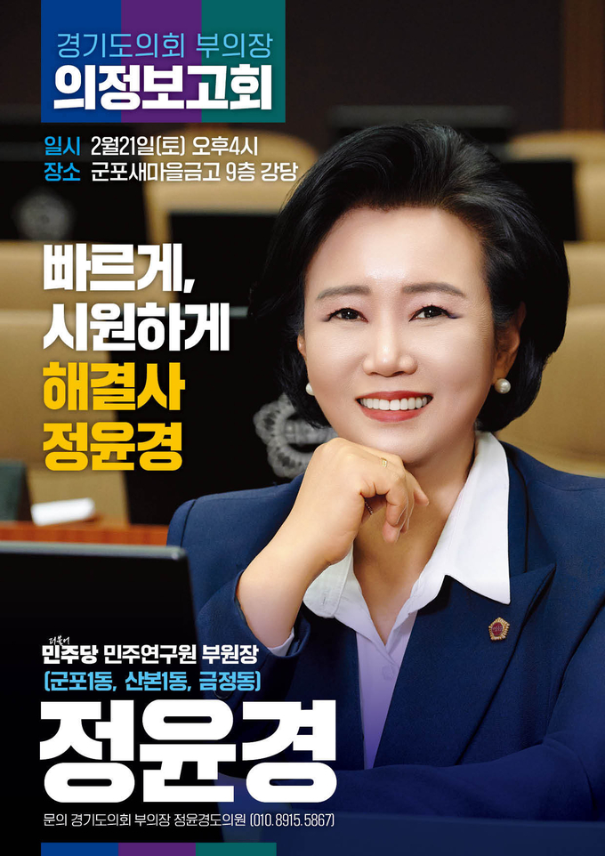 한편 정윤경 부의장은 지난 19일 군포시장 출마를 선언하고, 책임 있는 행정과 실천 중심의 시정 운영을 약속한 바 있다.