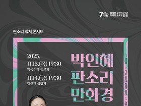 [정도일보 최명구 기자] 강릉단오제전수교육관에서는 오는 13~14일 오후 7시 30분, 강릉단오제전수교육관 공연장에서 이틀에 걸쳐 두 가지 다른 매력의 판소리를 렉처콘서트 형식의 '박인혜 판소리만화경'을 선보인다. 10일 시에 따르면 이틀 동안 펼쳐지는 이번 무대는 판소리 렉처콘서트로, 첫째 날 13일(목) '박록주제 흥보가' 무대에서는 사설의 간결함과 진중한 성음을 특징인 '박록주제 흥보가'를 들려주며 형제간의 우애와 부의 역전, 그리고 서민의 해학과 재치가 살아 숨 쉬는 무대를 해설과 함께 보여준다. 둘째 날 14일(금) '강산제 심청가' 무대에서는 절제된 방식으로 감정을 표현하는 것이 특징인 '강산제 심청가'를 지극한 효심과 함께 귀천 없는 인간 세상을 그려낸 비장미가 뛰어난 판소리의 걸작을 해설과 함께 감상할 수 있다. 특히, '판소리만화경'은 단순한 서사 나열이나 설명 위주의 기존 렉처콘서트를 넘어, 소리꾼의 궁금증에서 출발한 문학적·사회적·음악적 시선을 관객과 나누는 무대이다. 이번 공연은 소리꾼이자 창작자, 그리고 문학 박사인 박인혜가 친근하면서도 깊이 있는 해설로 판소리의 맥락을 풀어내며 관객에게 새로운 감각과 해석을 선사한다. 공연명 '만화경