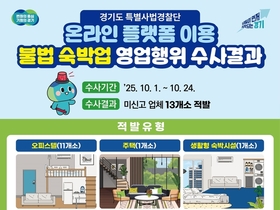 [정도일보 김제영 기자] 숙박업 신고 없이 오피스텔, 주택 등에서 영업을 한 불법 숙박업체 13곳이 경기도 특별사법경찰단 수사에 적발됐다. 경기도 특별사법경찰단은 10월 1일부터 24일까지 고양, 부천, 성남, 화성, 안양, 김포, 용인, 파주 등 8개 지역에서 불법영업으로 의심되는 숙박업소에 대한 단속을 벌여 미신고 영업 13곳 25개 객실을 적발했다고 11일 밝혔다. 유형별로는 ▲오피스텔 11개소 ▲주택 1개소 ▲생활형 숙박시설 1개소이다. 특사경은 숙박 당일 주소를 통보하는 등 정확한 위치가 노출되지 않는 공유 온라인 플랫폼의 특징을 악용해 오피스텔, 주택 등을 임차한 후 숙박시설로 운영한 업소를 집중적으로 단속했다. 주요 사례를 보면 A업소는 부천시 오피스텔 3개 객실을 이용 숙박업을 운영하며 3년 9개월 동안 약 2억 원의 불법 매출을 올리다가 적발됐다. 안양시 B업소는 오피스텔 3개 객실을 1년 9개월 동안 운영하며 약 1억2천만 원을 벌어들였다. 파주시 C업소는 생활형숙박시설 2개 객실을 2년간 운영하며 약 7,200만 원의 수익을 내다 덜미를 잡혔다. 이들 업소는 관할 관청에 숙박업 신고를 하지 않고 숙박업을 운영해 부당수익을 얻은 업체들로,
