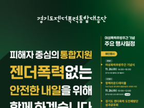 [정도일보 김제영 기자] 경기도와 경기도여성가족재단 젠더폭력통합대응단(이하 대응단)은 여성폭력추방주간(11월 25일~12월 1일)을 맞아 도민과 함께하는 다양한 행사를 추진한다고 13일 밝혔다. 여성폭력추방주간은 유엔(UN)이 제정한 ‘세계 여성폭력 추방의 날’(11월 25일)을 기념하기 위해 마련된 기간으로, 폭력 없는 사회 실현과 피해자 보호의 중요성을 되새기기 위한 뜻깊은 주간이다. ‘피해자 중심의 통합지원, 젠더폭력 없는 안전한 내일을 위해 함께 하겠습니다’라는 표어 아래 도와 대응단은 도내 대학 인권센터 종사자 역량강화 워크숍(11월 6일)에 이어 ▲도민 대상 젠더폭력 예방교육(11월 3일~12일) ▲아동·청소년 성착취 피해 대응 간담회(11월 25일) ▲도민예방단 성과공유회(11월 29일) ▲아동·청소년 성착취 피해예방을 위한 오프라인 아웃리치(거리상담)(12월 1일) 등 현장 중심의 프로그램을 연이어 추진한다. 또한 11월 한 달간 ‘젠더폭력 없는 내일을 위한 1,000인 희망 챌린지’ 누리소통망(SNS) 캠페인을 진행하고 있으며, 도내 각 기관이 추진하는 주요 행사를 한눈에 볼 수 있는 ‘경기도 여성폭력추방주간 행사 안내지도’를 제작·공개할 예