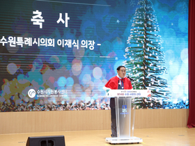 [정도일보 고정희 기자] 수원특례시의회(의장 이재식)는 19일, 시청 대강당에서 열린 ‘kt wiz, ENA와 함께하는 제14회 수원 사랑의 산타’에 참석했다. 이번 행사에는 이재식 의장을 비롯한 수원특례시의회 의원, 자원봉사자, kt wiz 프로야구단 등이 참석해 후원금 전달과 산타복 퍼포먼스, 영상 상영 등 다채로운 프로그램을 통해 지역사회 나눔의 가치를 시민과 함께 나누는 뜻깊은 시간을 가졌다. 이재식 의장은 “산타는 그 이름만으로도 기쁨과 행복을 전한다”라며 “오늘 이 자리가 아이들과 시민들에게 오래도록 남을 꿈과 희망이 되길 바란다”고 말했다. 이어 “따뜻한 나눔을 실천해 주신 kt wiz 선수단과 ENA, 자원봉사자 여러분께 깊이 감사드린다”고 강조했다. 한편, 이날 전달된 후원금과 선물은 관내 사회복지시설과 취약가구에 지원될 예정으로, 이번 행사는 연말을 맞아 민관이 함께하는 나눔의 의미를 되새기는 계기가 됐다.