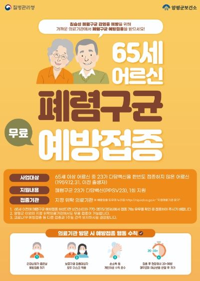 (정도일보) 양평군이 지역 내 65세 이상 어르신을 대상으로 폐렴구균 무료 예방접종을 연중 실시한다고 밝혔다.