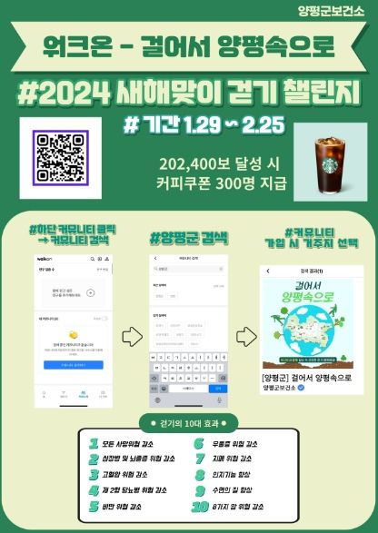 해당 챌린지는 워크온 앱 설치 후 ‘걸어서 양평속으로’ 커뮤니티 내 ‘새해걷기 챌린지’ 참여하기 버튼을 누르면 참여 가능하며 25일부터 참여 예약을 받고 있다.
