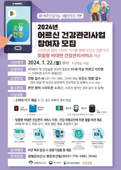 이번 비대면 어르신 건강관리 사업은 코로나 19 이후 건강 증진 서비스 접근성이 떨어지는 어르신을 대상으로 하며 지속가능한 비대면 건강관리 서비스 체계를 구축하고자 추진됐다. 양평군은 2022년 10월 보건복지부 주관 공모사업에 선정돼 지난해 7월부터 사업을 시작했다..