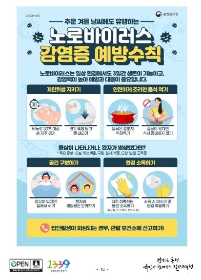 또한, 노로바이러스감염병 예방을 위해 ▲올바른 손씻기의 생활화 ▲채소·과일은 흐르는 물에 깨끗이 씻어먹고, 껍질벗겨먹기 ▲음식물 충분히 익혀먹기 ▲끓인 물 마시기 ▲위생적으로 조리하기 등의 위생수칙 준수를 당부한다.