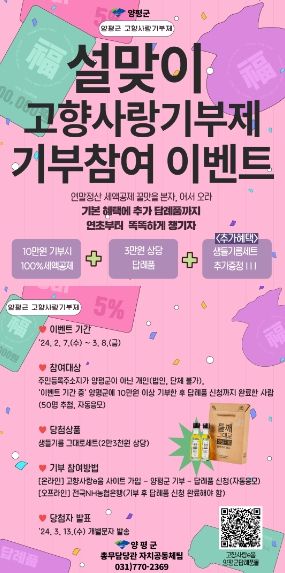 전진선 군수는 “고향사랑기부제로 양평을 응원해주신 모든 기부자분께 감사드린다”며 “설 명절맞이 이벤트를 통해 기부자분들에게 양평땅에서 난 답례품으로 보답할 수 있어서 뿌듯하다. 기부해주신 기부금은 기금사업을 적극 발굴해 사람과 자연 행복한 양평만들기에 최선을 다하겠다”고 밝혔다.