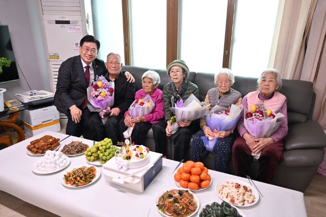 이날 주민들과 경로당 회원들은 어르신들을 위해 맛있는 식사와 다과를 준비했으며 구순이 넘은 어르신 다섯 분에게 만수무강과 공경의 마음을 담아 큰절을 올리고 꽃다발을 전달했다.