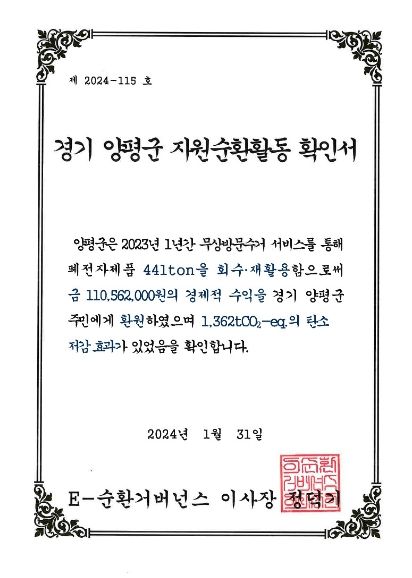 폐가전제품 무상 방문 수거 서비스는 E-순환거버넌스 배출예약시스템을 통해 별도 수수료 없이 이용할 수 있다. 수거된 폐가전은 양평자원순환센터 집하장으로 운반 후 재활용업체로 인계돼 냉매·형광 물질 등을 친환경적으로 처리하고 철·구리 등은 재활용한다.