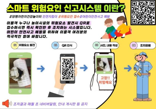 스마트 위험요인 신고시스템은 이용객의 시선에서 놀이 공간의 위험요소를 발굴하고 개선하기 위해 실시된다. 이용객이 놀이터 이용 중 발견한 놀이시설의 위험요소 또는 개선이 필요한 사항을 QR코드를 통해 접수하면 된다. 신고된 나용은 실시간으로 담당자에게 통보되며 조치 결과는 매월 자체 게시판 또는 네이버 알림을 통해 게시될 예정이다.