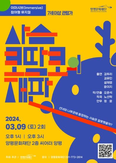 (정도일보) 양평문화재단이 오는 3월 9일 토요일 양평문화재단 2층 씨어터 양평에서 오후 1시와 3시, 2회에 걸쳐 어린이 기획 공연 ‘사슴 코딱코의 재판’을 선보인다.