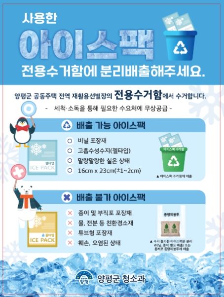 (정도일보) 양평군이 공동주택에서 배출되는 아이스팩을 재활용해 필요한 사업자, 주민 등에게 제공하는 ‘아이스팩 순환사업’을 실시한다고 27일 밝혔다.