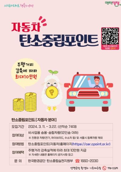 (정도일보) 양평군이 자동차 탄소중립포인트 참여자를 이달 11일부터 22일까지 선착순 74명을 모집한다고 밝혔다.