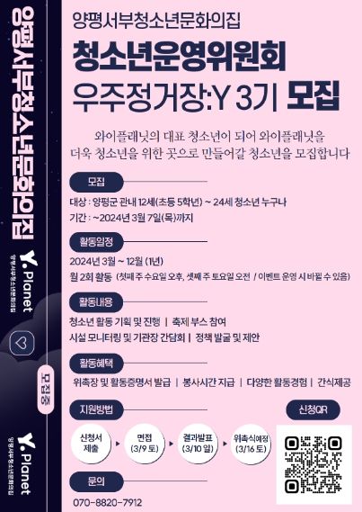 양평서부청소년문화의집에서 운영하는 이번 3기 청소년운영위원회 명칭은 ‘우주정거장:Y’이다. 청소년운영위원회 청소년들은 직접 활동을 기획, 진행하고 지역의 다양한 축제 부스에 참여할 수 있게 된다. 또한, 청소년 활동과 관련된 정책을 직접 발굴하는 등 주체적인 활동을 이어간다.