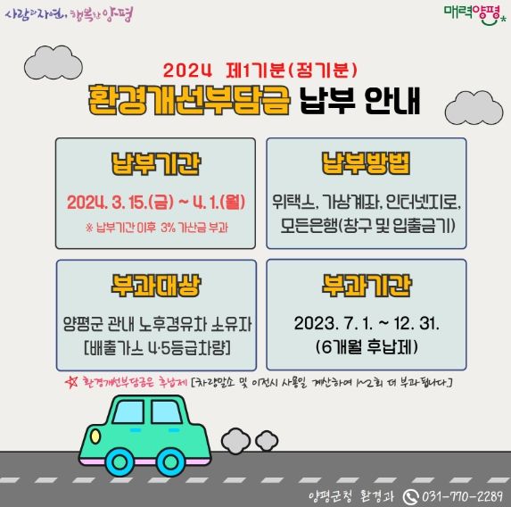 (정도일보) 양평군이 관내 노후경유차(배출가스4·5등급) 소유자에게 2024년 제1기분 환경개선부담금을 부과했다. 제1기분 환경개선부담금 부과건수는 총 4,824건이며, 금액은 157,909,080원이다.