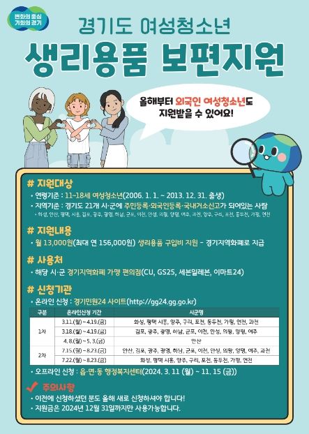 지원 금액은 1인당 월 1만3,000원, 연간 최대 15만6,000원으로, 경기지역화폐 모바일 카드로 지급되며 사용 기한은 올해 12월 31일까지이다. 구매처는 CU, GS25, 세븐일레븐, 이마트24 편의점 중 지역화폐 가맹점이며 생리용품만 구매할 수 있다.