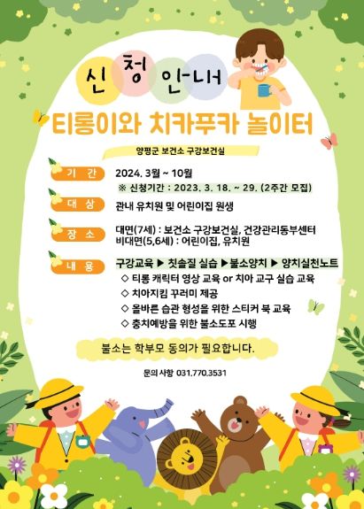배명석 보건소장은 “구강건강은 예방이 중요한 만큼, ‘티롱이와 치카푸카 놀이터’를 통해 우리 아이들이 올바른 구강관리 습관을 형성하고 평생 치아건강을 유지할 수 있도록 어린이집과 유치원의 적극적인 참여를 부탁드린다”고 말했다.