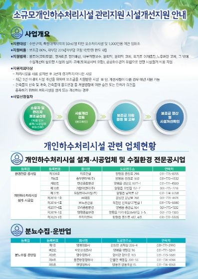 이번 사업은 관내 팔당상수원 관리 지역인 상수원보호구역, 수변구역, 특별대책지역 내 일처리량 50㎥ 미만의 오수처리시설과 처리대상 인원이 1천명 미만의 정화조인 소규모 개인하수처리시설을 대상으로 한다.