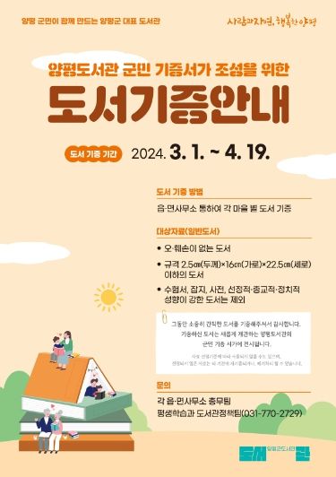 군은 오는 19일까지 읍면사무소를 통해 도서를 기증받으며 도서 기증과 관련해 기타 자세한 내용은 평생학습과 도서관정책팀 또는 읍면사무소 총무팀으로 문의하면 된다.