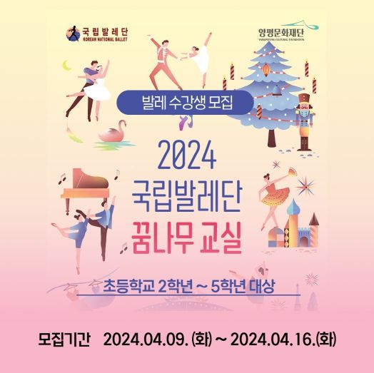 양평군에 거주하는 다자녀, 한부모, 문화혜택 취약지역 등 취약계층 가정의 초등학생 2~5학년을 대상으로 발레 수업을 제공해 문화예술 체험의 사각지대를 최소화하고 신체적·정서적으로 건강한 성장을 지원하고자 4월 9일부터 16일까지 참가자를 모집한다.