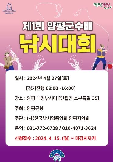 (정도일보) 양평군은 오는 27일 단월면 대명낚시터에서 제1회 양평군수배 낚시대회를 개최한다고 밝혔다.