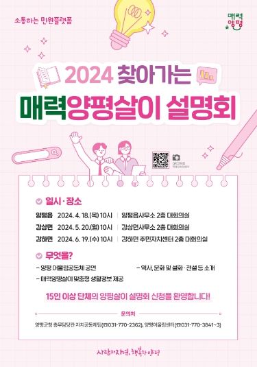전진선 양평군수는 “올해부터 전입자들에게 실질적으로 도움이 될 수 있도록 각 읍면사무소로 찾아가는 매력양평살이 설명회를 기획했다”면서 “이번 설명회를 통해 일상생활에 필요한 정보를 얻고 양평의 사람과 자연 등 양평만의 매력을 많이 알아가는 자리가 되시길 바란다”고 말했다.