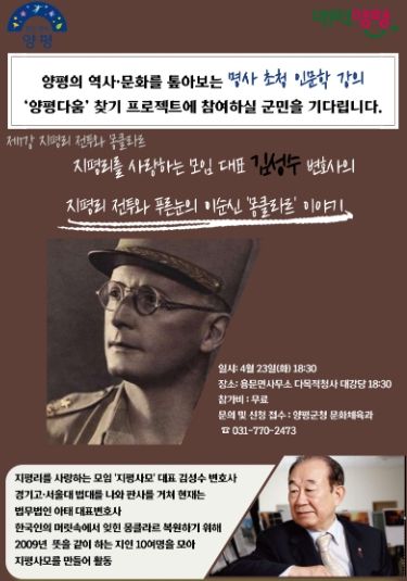 첫 번째 강연자는 ‘지평리를 사랑하는 모임’의 대표 김성수 변호사로 ‘지평리 전투와 몽클라르’를 주제로 용문 다목적 청사 대강당에서 포문을 연다.