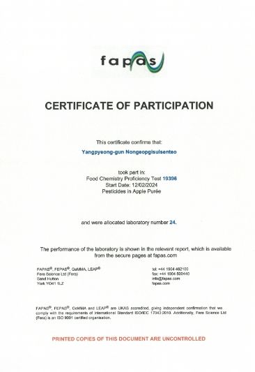 영국 식품환경연구청(FERA)이 운영하는 FAPAS(Food Analysis Performance Assessment Scheme)는 국제 비교 숙련도 테스트 프로그램으로, 전세계 기관들과 분석분야(잔류농약 등)에서 숙련도가 어느 정도인지를 비교하는 평가이다. 해당 평가는 국제적으로 인지도가 높아 매년 세계 각국의 정부기관, 대학 연구소, 민간분석기관 등이 평가에 참여하고 있다.