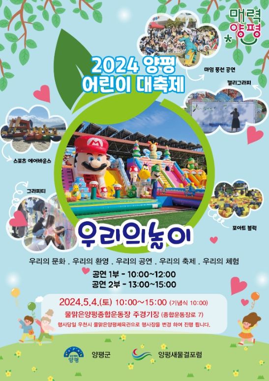 (정도일보) 양평군은 어린이날을 맞아 오는 4일 물맑은양평종합운동장 주경기장에서 2024 양평 어린이 대축제 ‘우리의 놀이’를 개최한다고 밝혔다.