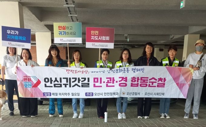 오산시는 시민의 안전한 밤거리를 위해 시민단체, 경찰과 함께 매월 마지막 주 월요일마다 유동인구가 드문 지역이나 범죄 취약지역, 유흥가 등을 합동순찰하고 있다.