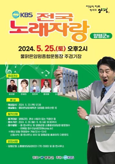 (정도일보) 양평군은 오는 5월 25일, 양평읍 소재 물맑은양평종합운동장에서 ‘KBS 전국노래자랑 양평군편’을 개최한다고 밝혔다. 이번 행사는 6년 만에 개최되는 주민 화합의 문화 축제로, 지역민들의 관심이 집중되고 있다.
