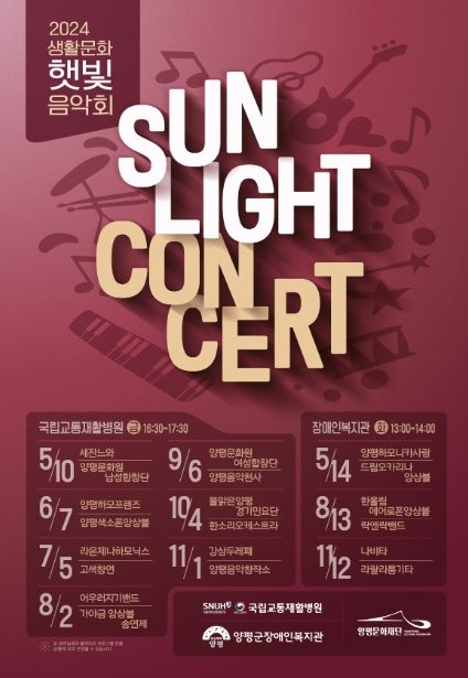 ‘2024 생활문화 햇빛 음악회’는 국립교통재활병원과 양평군장애인복지관에서 열리는 공연으로, 공모를 통해 선정된 20개 생활문화 동호회의 특색있는 공연을 제공해 군민들에게 특별한 음악 경험과 감동을 선사하는 것이 취지이다.