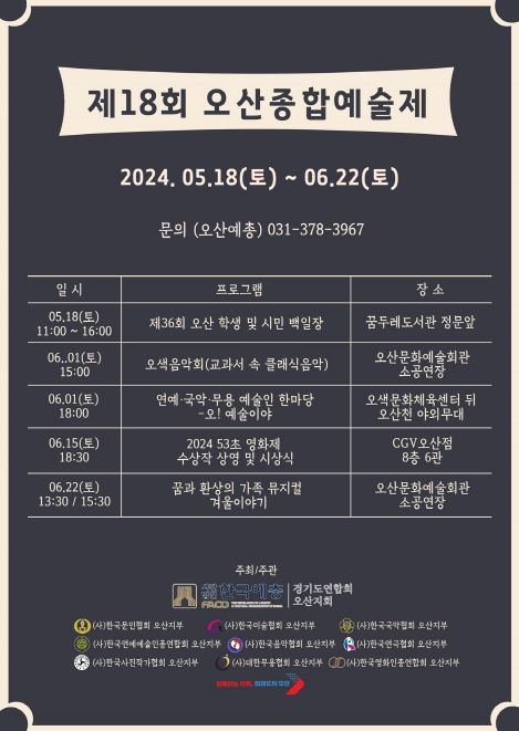 행사는 ▲문인협회의 ‘오산학생·시민백일장’을 시작으로 ▲음악협회 ‘오색음악회-교과서 속 클래식음악’ ▲연예·국악·무용협회 ‘예술인 한마당-오! 예술이야’ ▲영화인협회 ‘53초 팝콘영화제’ ▲연극협회 ‘꿈과 환상의 가족뮤지컬 – 겨울이야기’등 다양한 장르의 문화 예술 프로그램으로 진행된다.