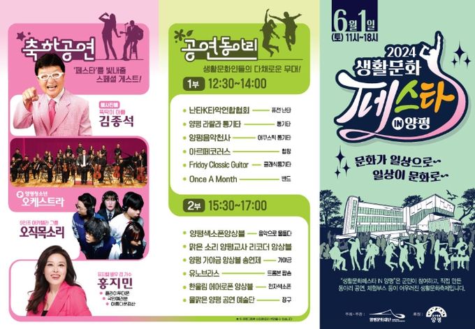 (정도일보) 양평문화재단이 주최하는 ‘2024 생활문화페스타 in 양평’이 오는 6월 1일 토요일 양평생활문화센터 앞에서 개최된다.