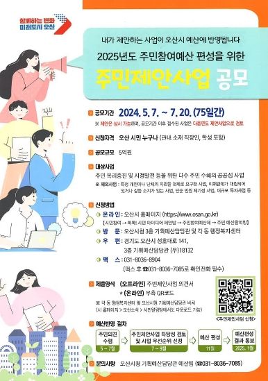 [정도일보 김제영 기자] 오산시는 오는 7월 20일까지 2025년 예산에 반영할 주민참여예산 제안사업 집중 공모를 실시한다고 밝혔다.