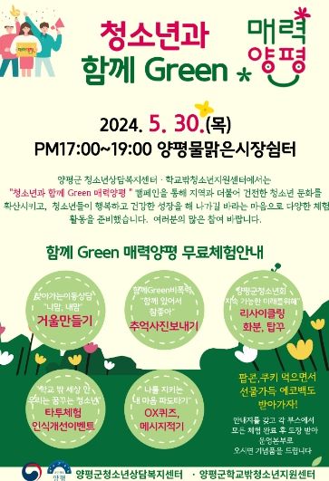 (정도일보) 양평군청소년상담복지센터와 양평군학교밖청소년지원센터는 오는 30일 양평물맑은시장 쉼터 일대에서 ‘청소년과 함께Green 매력양평’ 캠페인을 진행한다고 밝혔다.