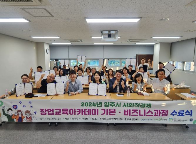 (정도일보) 양주시가 지난 29일 관내 경기섬유종합지원센터 중교육실에서 ‘2024년 사회적경제 창업교육아카데미 기본·비즈니스 과정 수료식’을 개최했다고 밝혔다.