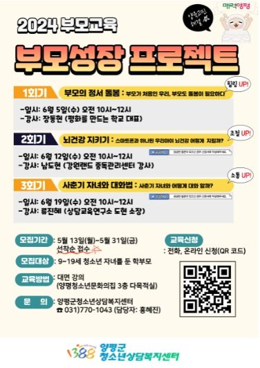 부모교육에 관심이 있는 관내 학부모들의 많은 참여를 바라며, ‘부모성장 프로젝트’ 부모교육과관련된 자세한 사항은 양평군청소년상담복지센터로 문의하면 안내받을 수 있다.