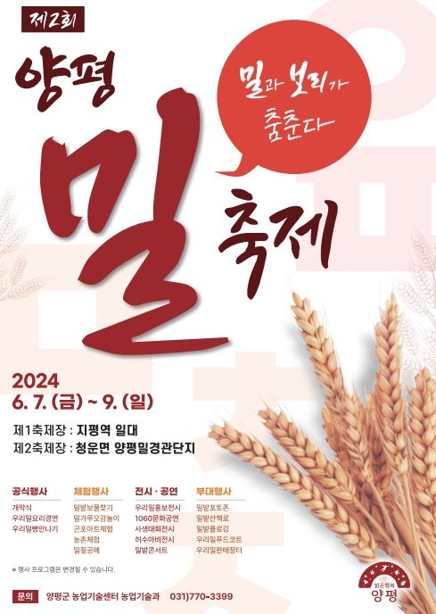 ‘밀과 보리가 춤춘다’를 슬로건으로 한 이번 축제는 제1축제장인 지평역 일대와 제2축제장인 청운면 양평밀경관단지에서 열린다. 6월의 황금밀밭을 배경으로 진행되는 축제는 앞으로 성장해나갈 양평 밀 산업의 새로운 비전과 포부를 알리는 장이 될 전망이다.