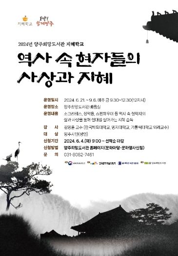 (정도일보) 양주시가 오는 6월 21일부터 9월 6일까지 매주 금요일 오전 양주희망도서관 배움실에서 ‘역사 속 현자들의 사상과 지혜’ 프로그램을 운영한다고 5일 밝혔다.