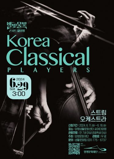 (정도일보) 양평문화재단의 「별빛물빛 콘서트 in 양평」 시리즈 6월 공연은 'korea Classical Players'의 무대가 마련되어 있다. 오는 6월 29일 15시, 양평생활문화센터 2층 씨어터 양평에서 열린다.