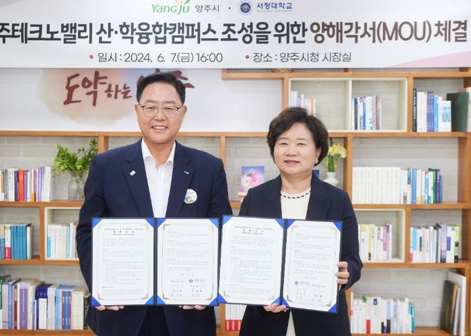 협약에 참석한 강수현 시장과 양영희 총장은 각각 양해각서에 서명하고 산단 캠퍼스를 양주테크노밸리의 혁신 성장거점으로 육성하는 데 상호 협력하기로 약속했다.