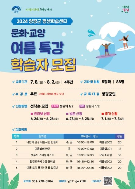 (정도일보) 양평군은 오는 24일부터 28일까지 군민을 대상으로 ‘2024년 양평군 평생학습센터 문화·교양 여름 특강’ 학습자를 선착순 모집한다고 밝혔다.