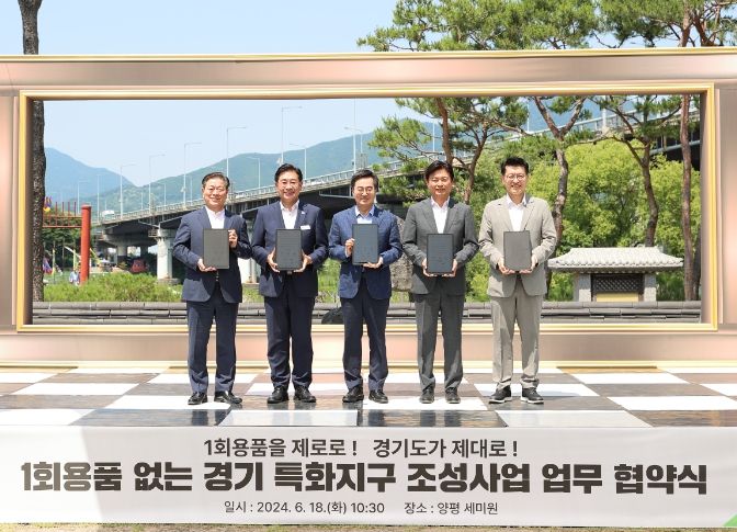 전진선 양평군수는 18일 김동연 경기도지사와 부천시장, 안산시 부시장, 광명시장과 함께 양평군 세미원에서 업무 협약을 맺고 1회용품 없는 특화지구를 조성하기로 합의했다.