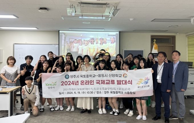 (정도일보) 양주시는 지난 19일 옥빛중학교 AI융합실에서 자매도시인 중국 둥잉시에 소재한 신양학교와 양주 옥빛중학교 간의 온라인 국제교류 발대식을 개최했다고 밝혔다.